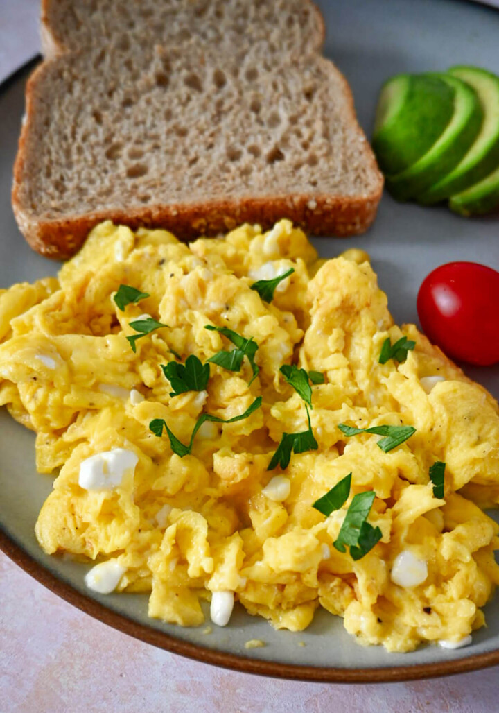 Des oeufs brouillés avec cottage cheese avec tomate, avocat et pain sur une assiette beige, café sur le coté.