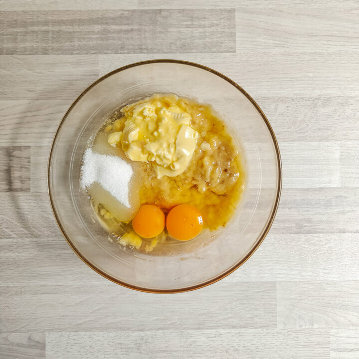- Préchauffer le four à 180°C. Dans un saladier, écraser les bananes à la fourchette jusqu'à obtenir une purée. Ajouter les œufs, le sucre, le beurre mou et l'extrait d'amande amère (pour un goût plus prononcé d'amande, ajouter 1 cuillère à café). Fouetter jusqu'à obtenir un mélange homogène.