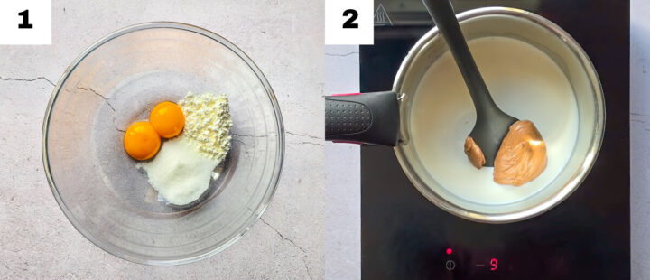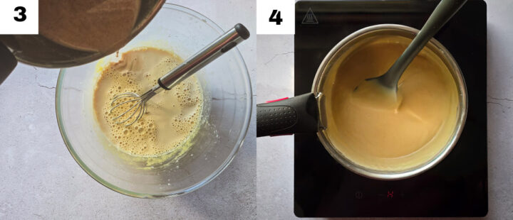 • Verser progressivement le lait chaud praliné sur le mélange œufs-sucre-maïzena, tout en fouettant pour éviter les grumeaux.