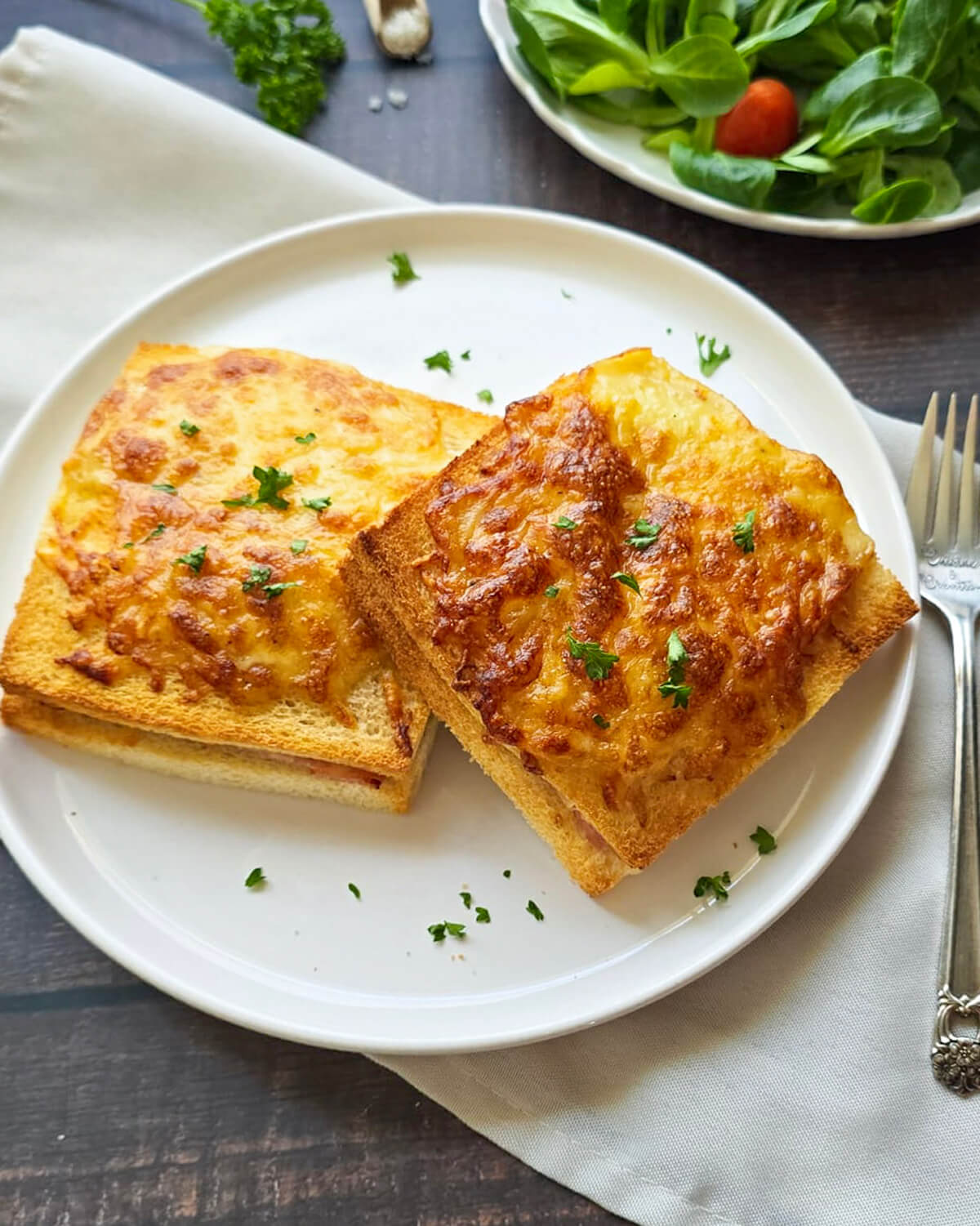 - Couper les croque-monsieur en diagonale et servir immédiatement avec une petite salade verte.