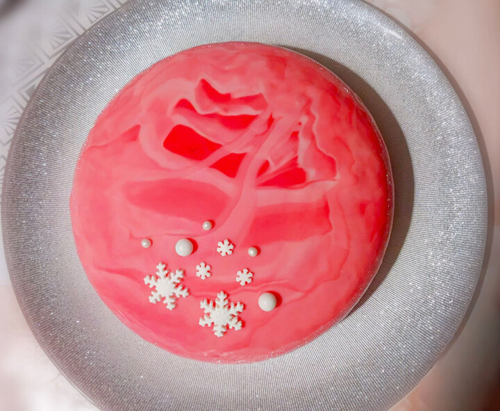 Une fois que votre entremets est bien figé, on vient préparer le glaçage miroir marbré (3 teintes de rose).