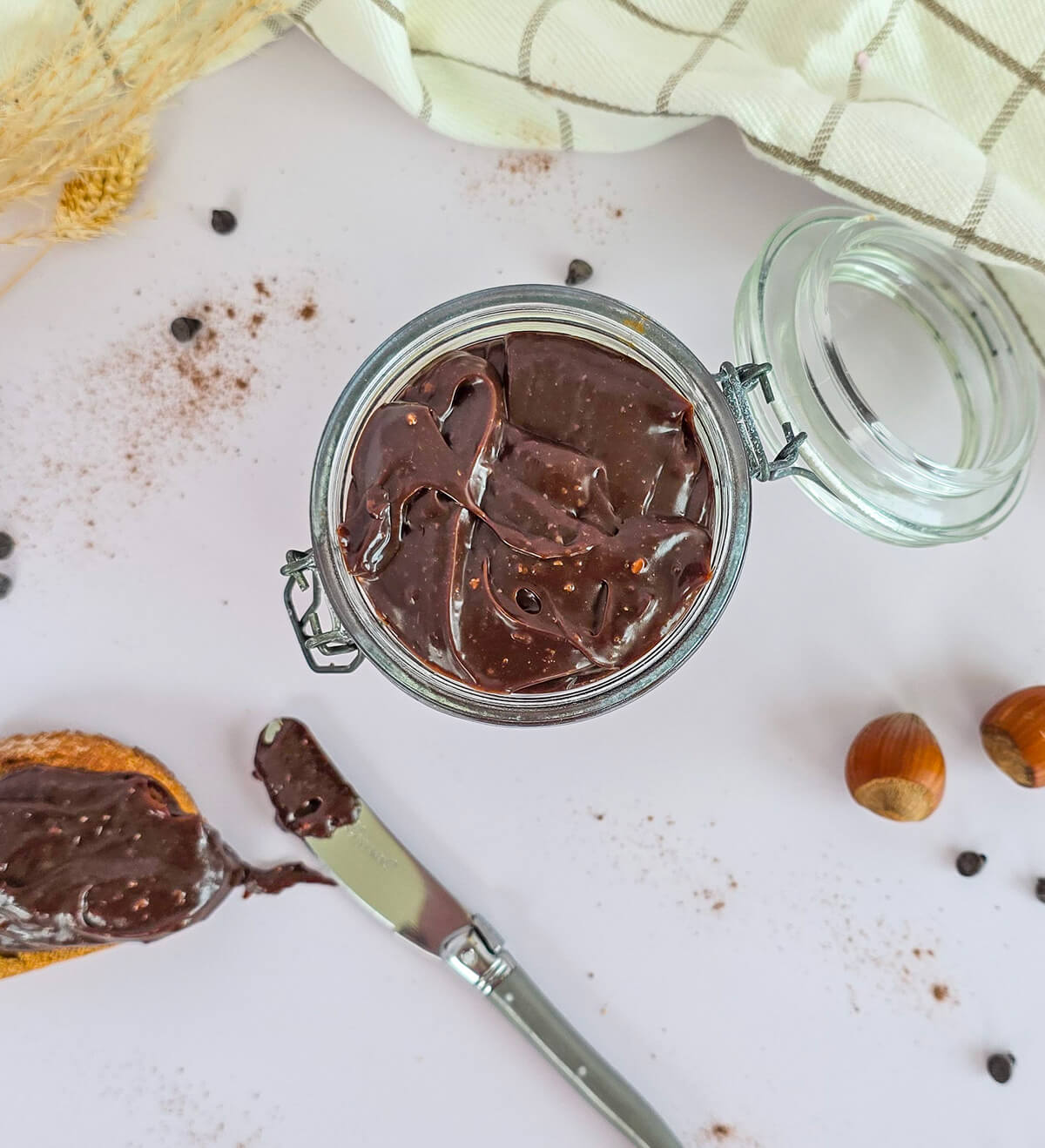 Bocal en verre ouvert rempli de pâte à tartiner maison onctueuse au chocolat noir et noisettes, avec une tartine généreusement nappée et un couteau à côté.