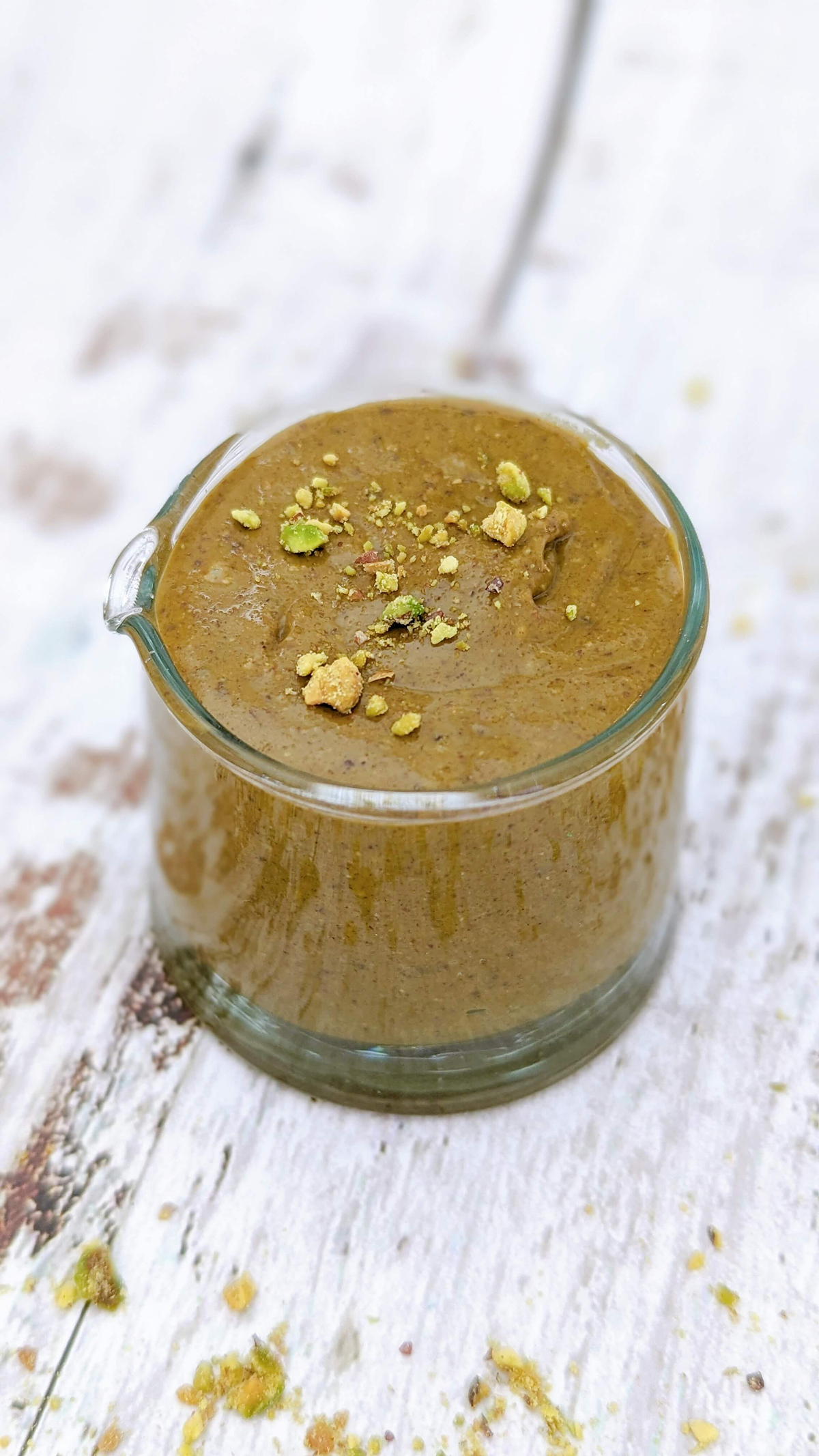 Du praliné pistache fait maison dans un petit contenant en verre, éclats de pistache concassées sur le dessus, sur un fond en bois clair.