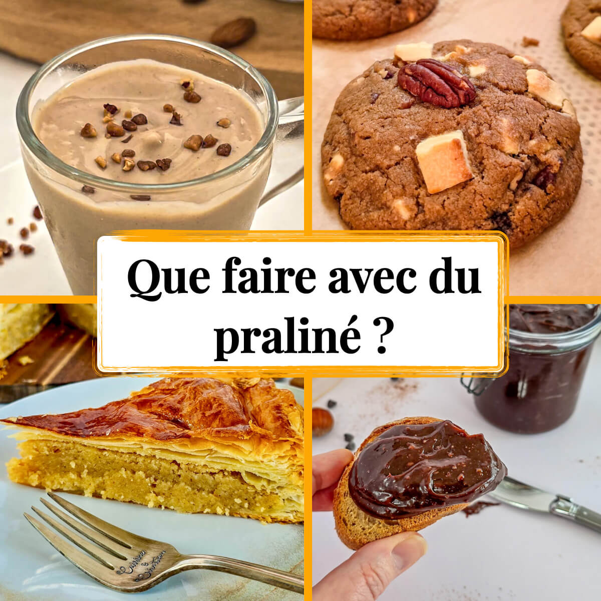 Un collage photo montrant 4 photos de recettes à faire avec du praliné maison, et au milieu le titre : que faire avec du praliné ?