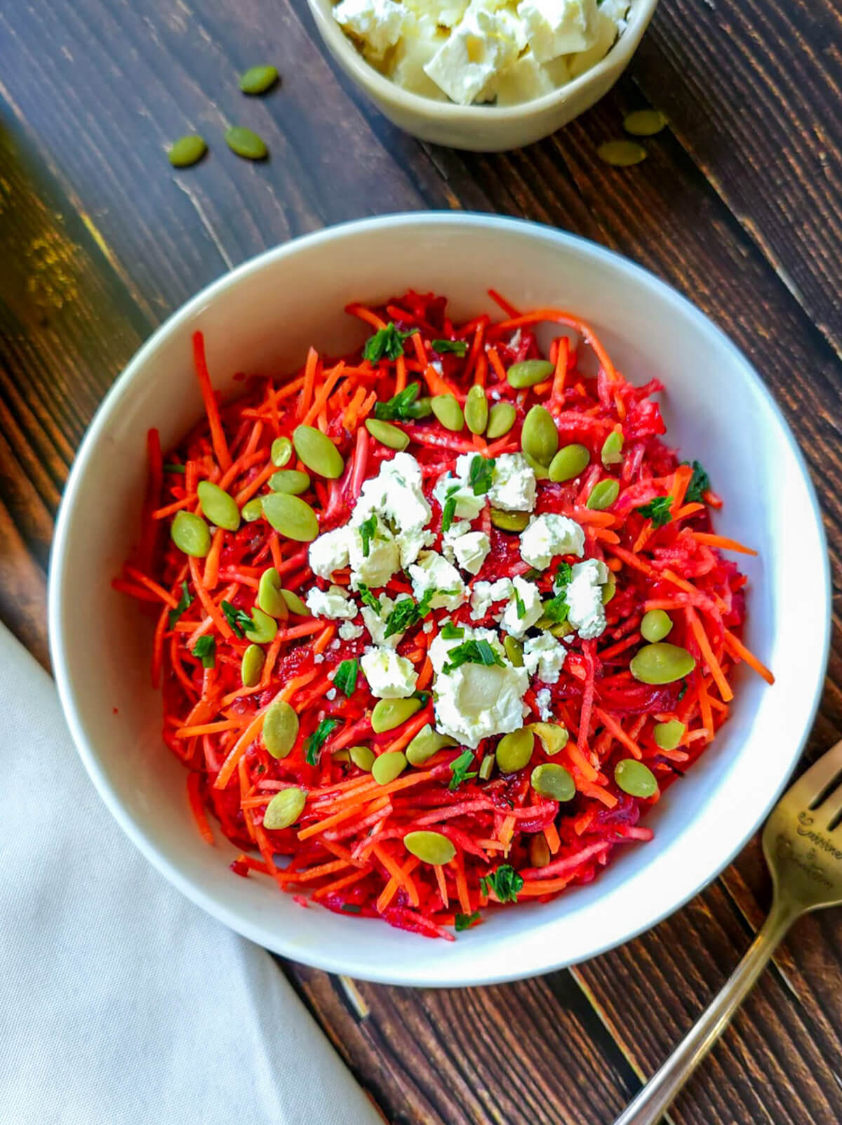 Un bol blanc rempli d'une salade de betterave, carotte et pomme, sur un fond en bois foncé, fourchette et torchon.