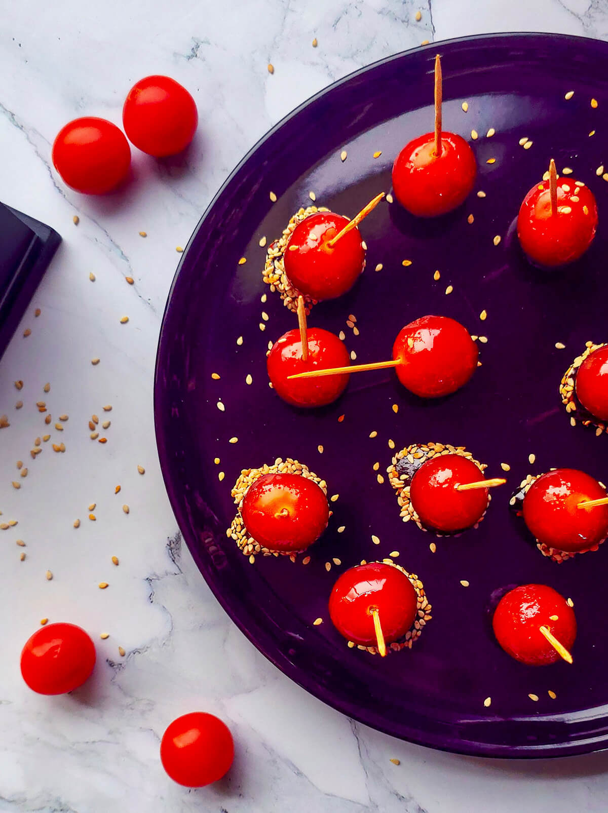 Sous leur coque de caramel craquant au sésame, ces petites tomates cerises d'amour cachent un cœur juteux et frais. Faciles et rapides à préparer, elles sont idéales pour vos tables de fête ou vos soirées entre amis.